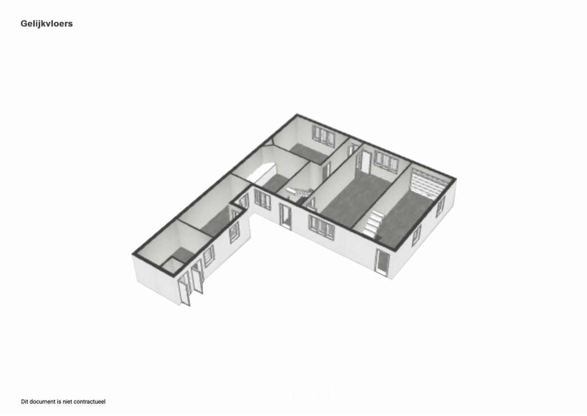 Gelijkvloers: inkomhal met trap, bureau/slaapkamer, leefruimte, ruime voor keuken; garage met zolder; tuin met 2 tuinberging en wc (opgelet voor septische put in tuin: onder plaat).