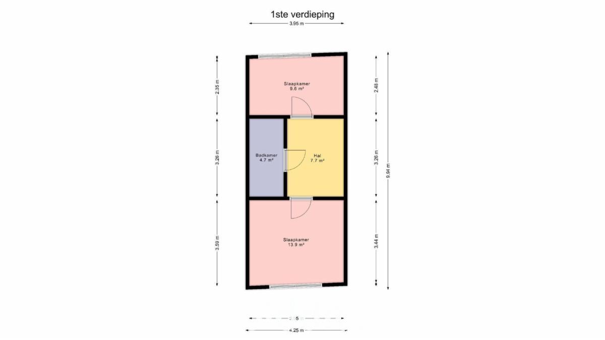 - 1e verdieping: hal, badkamer en 2 slaapkamers;