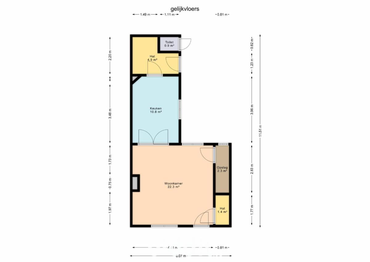 Het gelijkvloers is ingedeeld als volgt: woonkamer, keuken en hal;