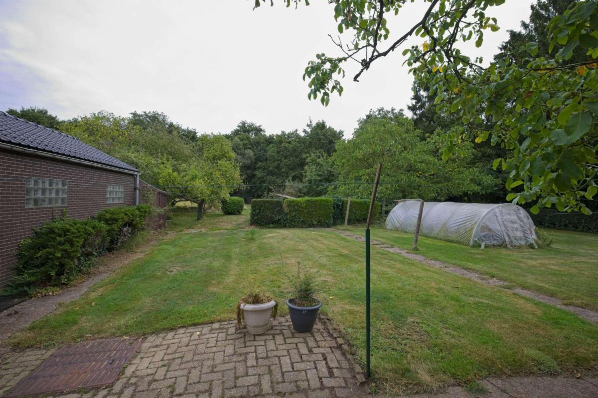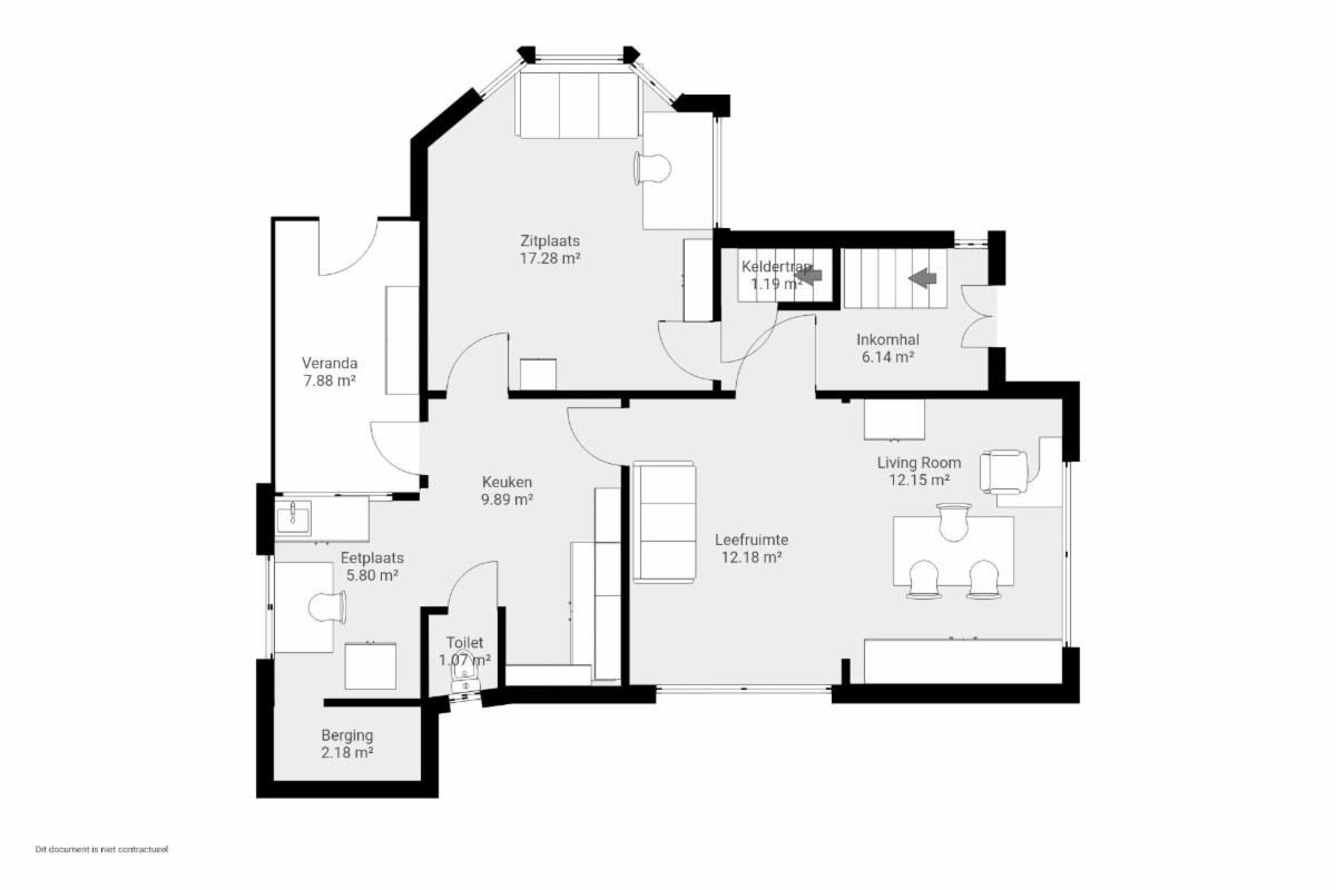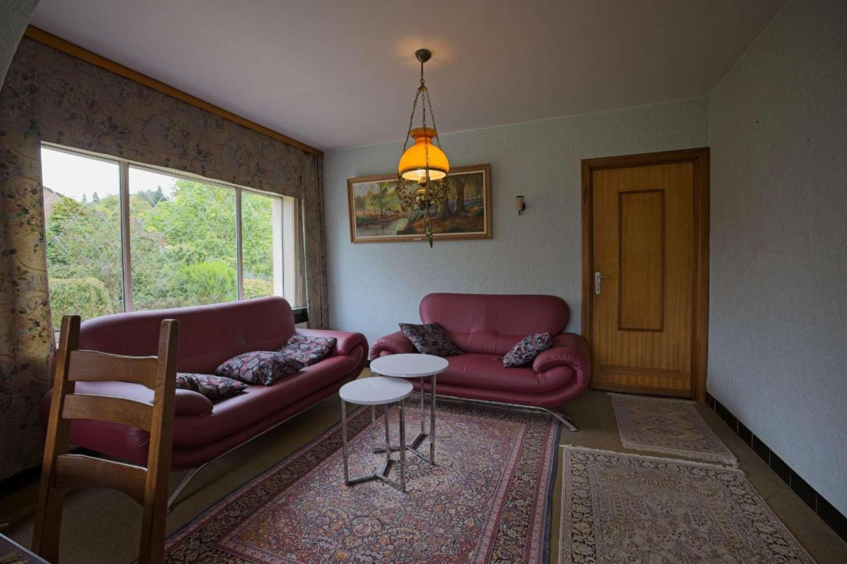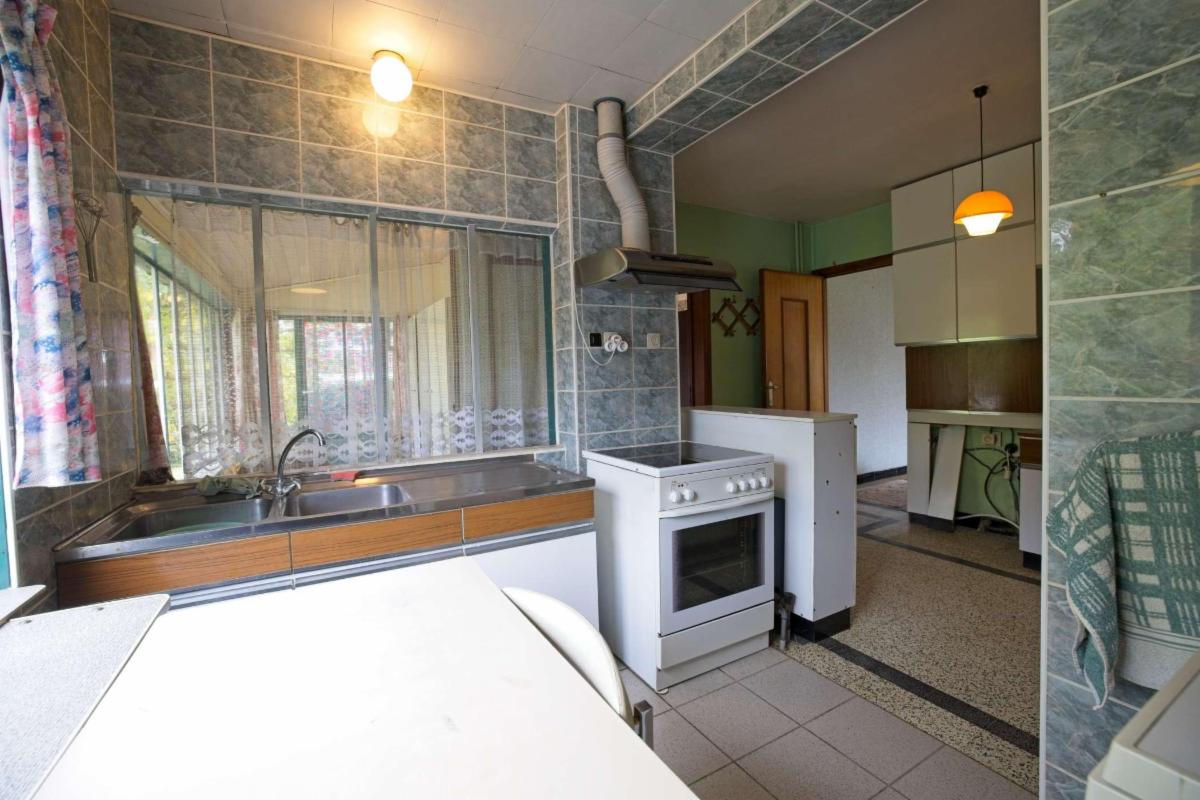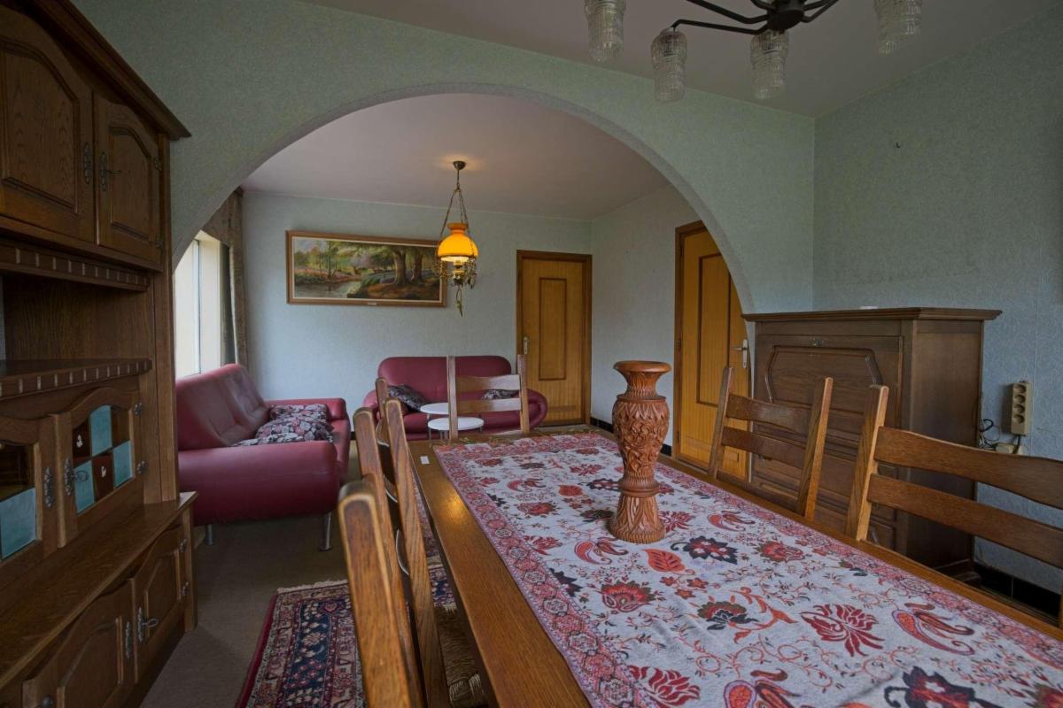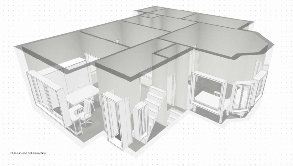 - Gelijkvloers: inkomhal, zitplaats, woonplaats, eetplaats, keuken, berging, WC, veranda, garage en tuin;