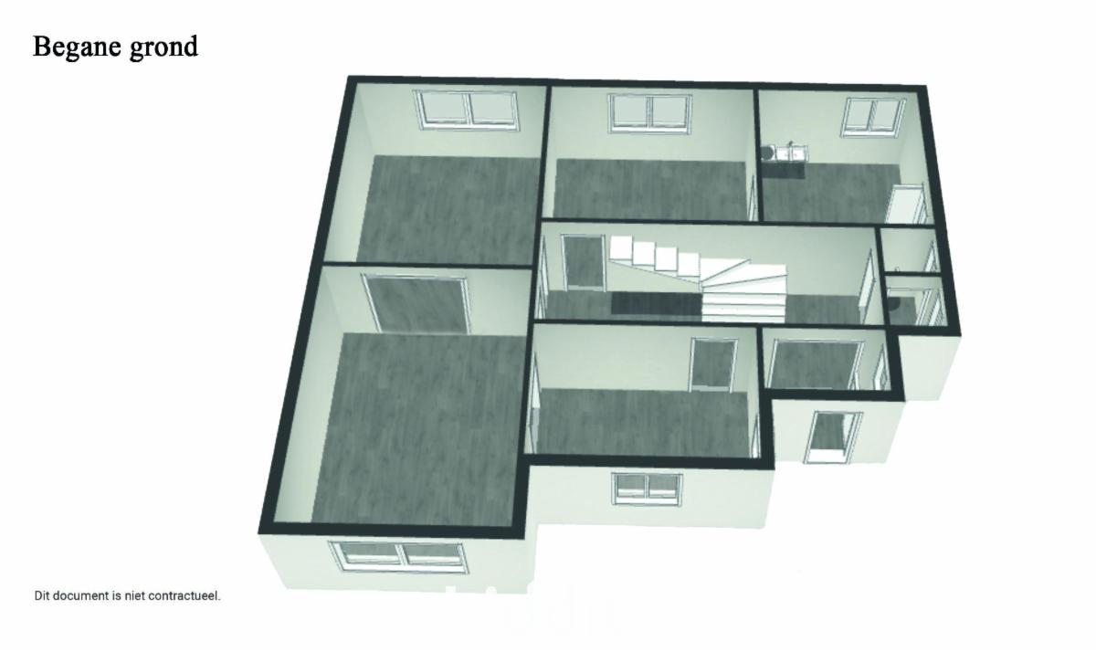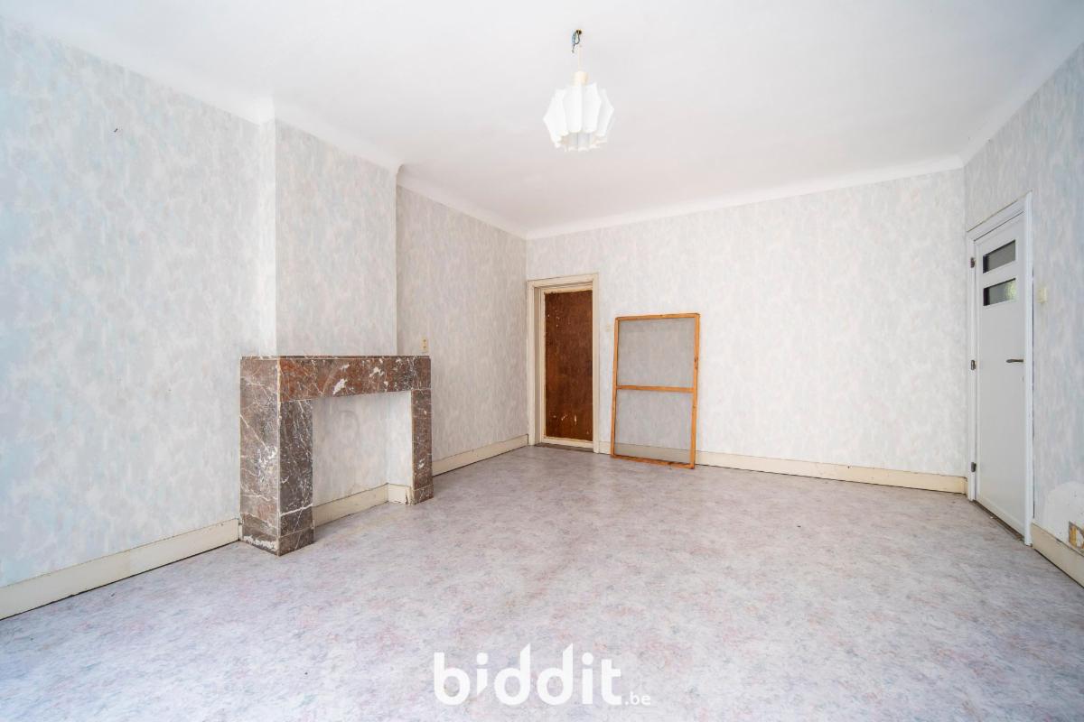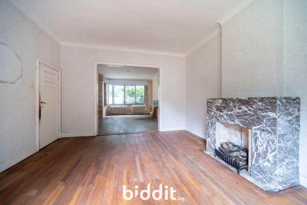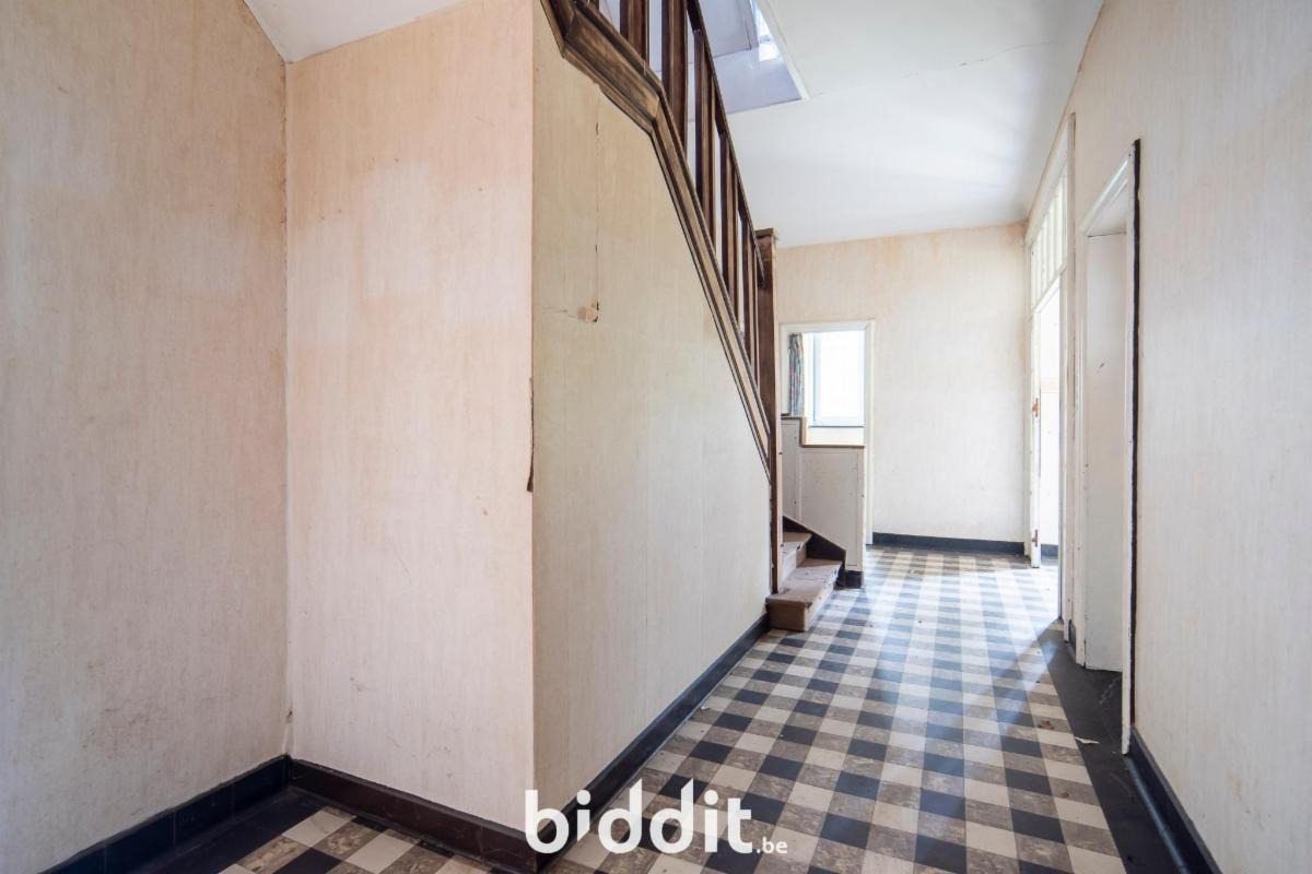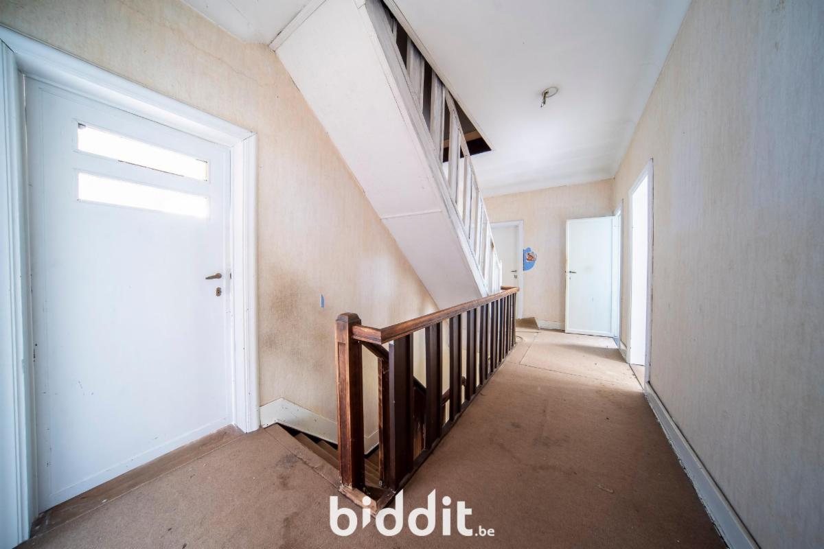 Men betreedt de woning in de inkom met trap naar boven en een apart toilet aan de inkomhal. Verder bevindt zich op het gelijkvloers nog een eet- en zitkamer, een keukenruimte en 2 extra in te richten kamers.