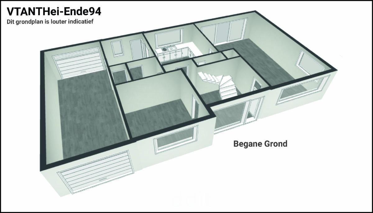 Gelijkvloers: inkomhal, toilet, inpandige garage, berging, bureau, keuken en lichtrijke woonkamer met uitzicht op de tuin