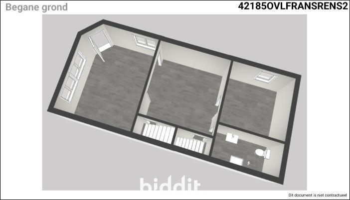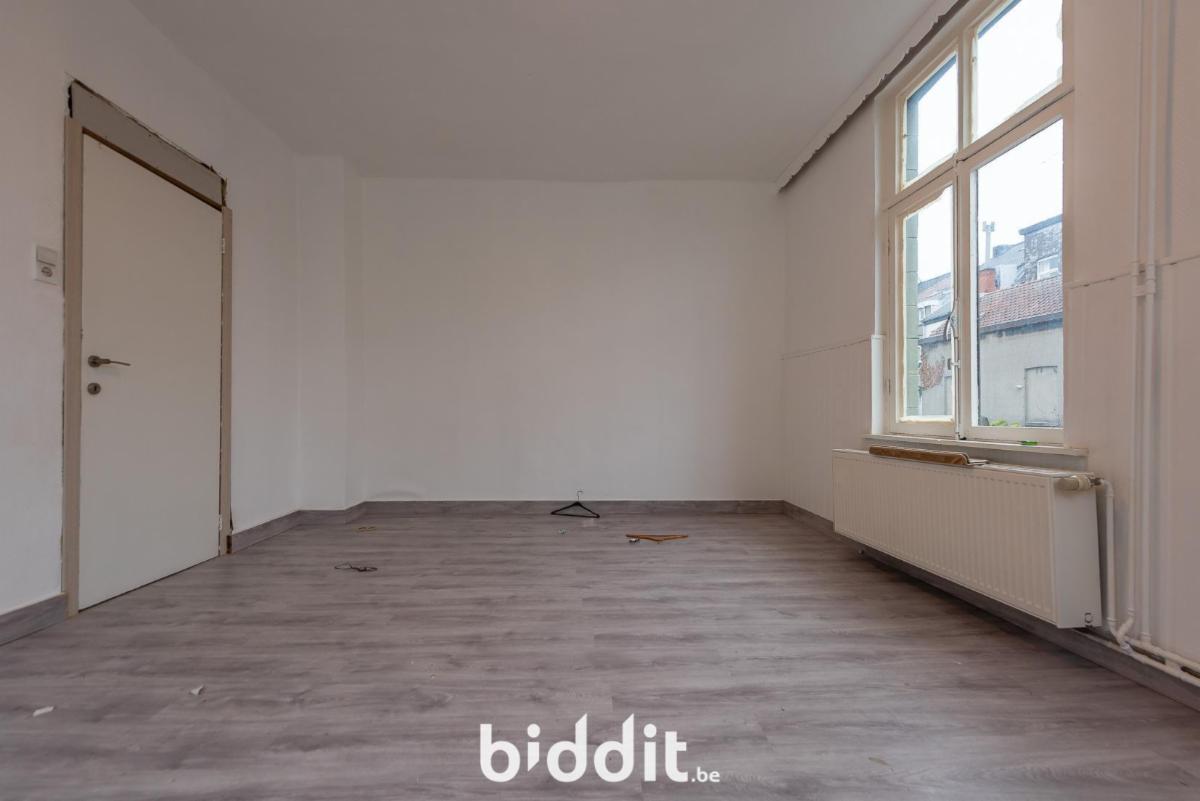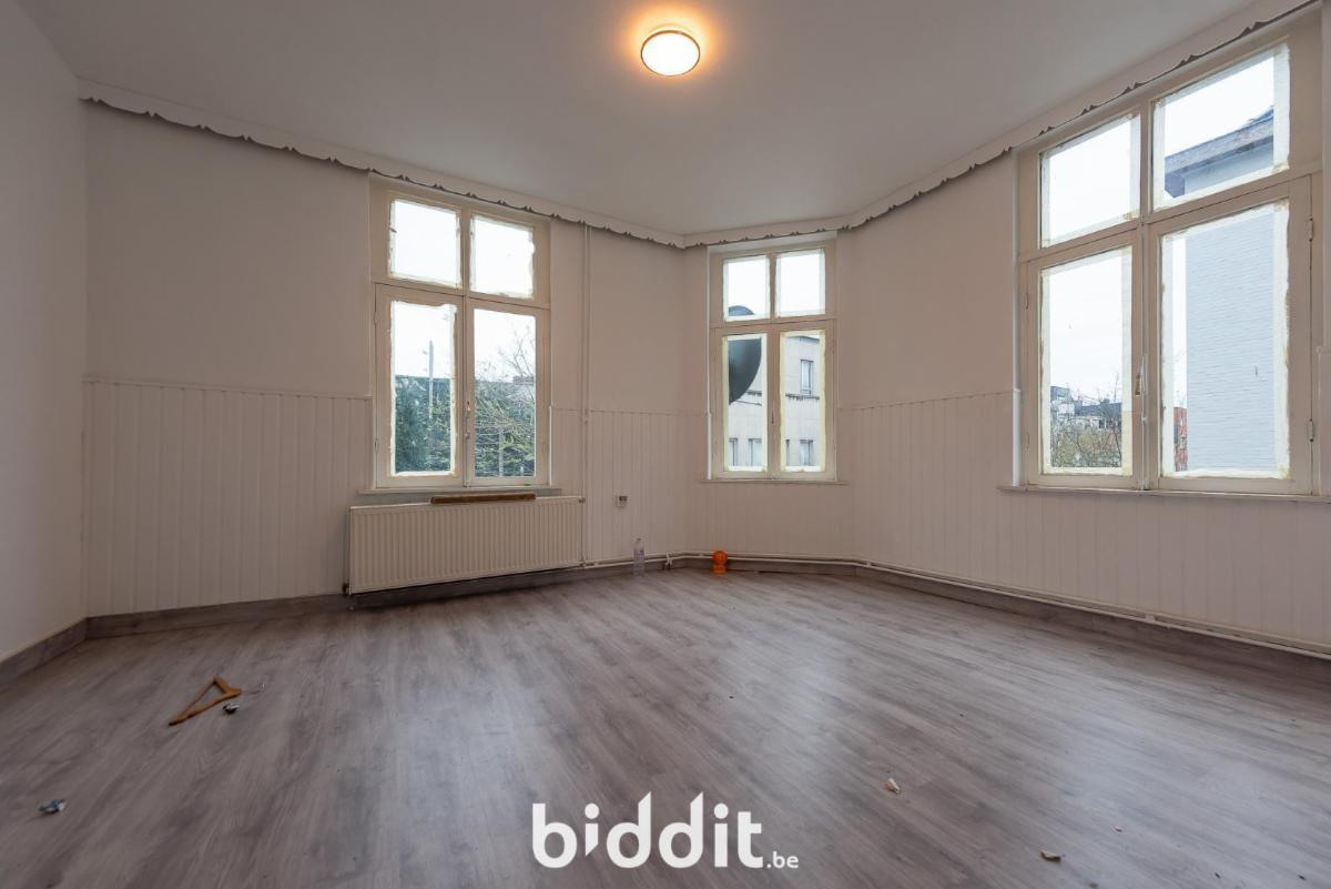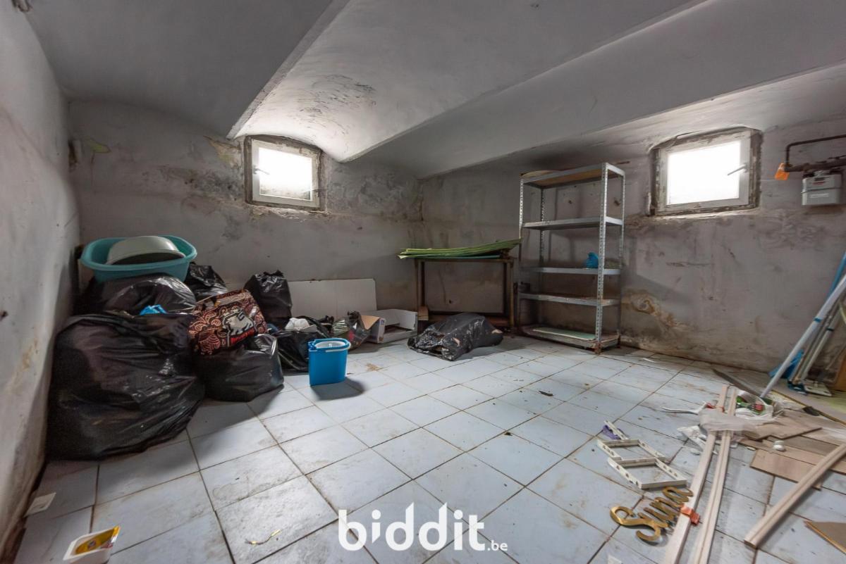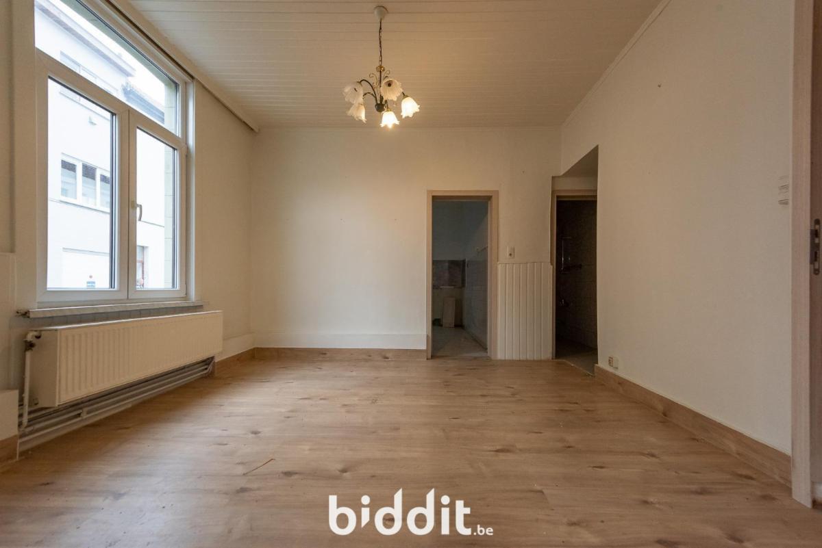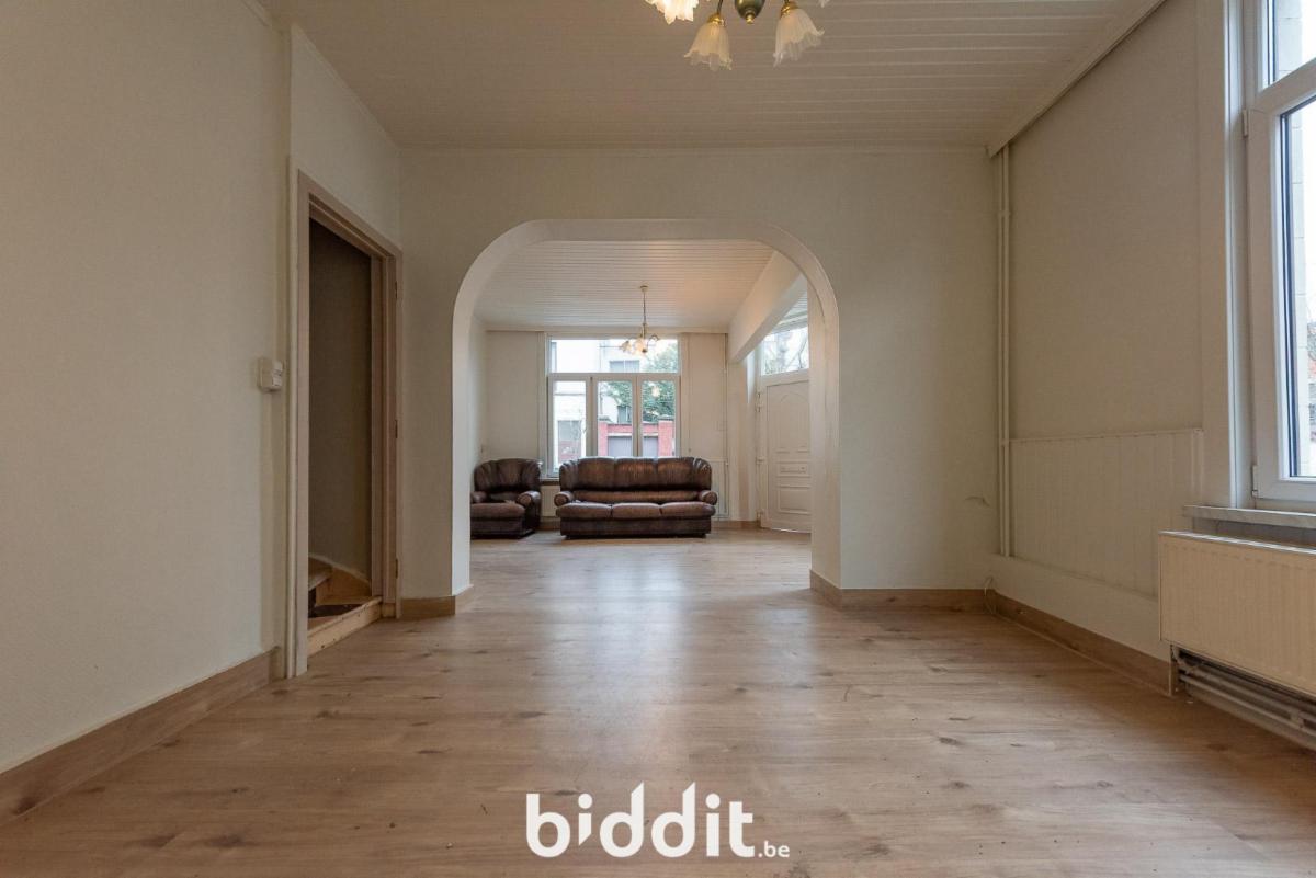 Gelijkvloers: living, ruimte voorzien voor keuken, badkamer en toegang tot kelder, trap naar de 1e verdieping;