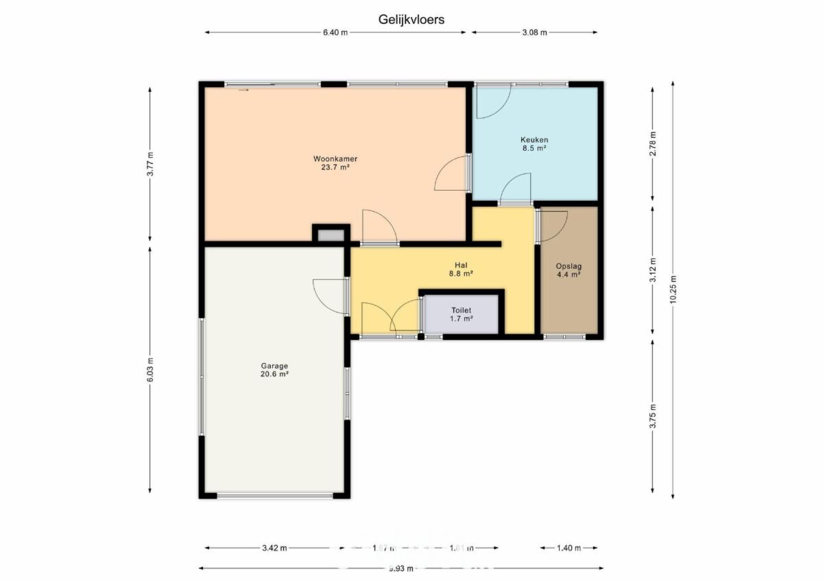 Gelijkvloers: woonkamer, keuken, berging, hal, toilet en garage;