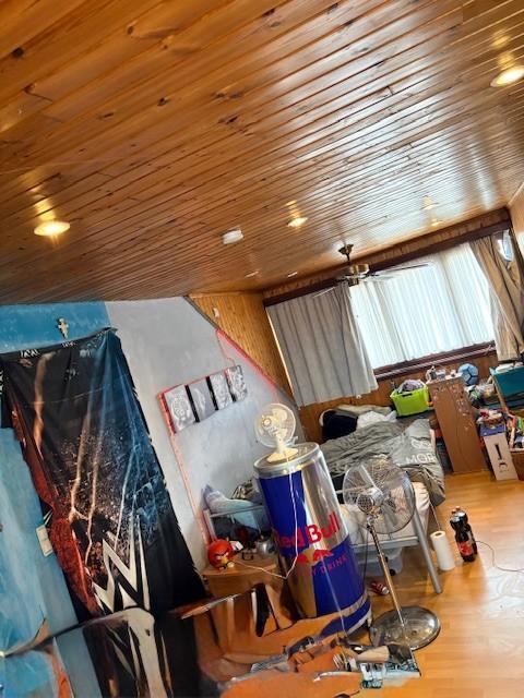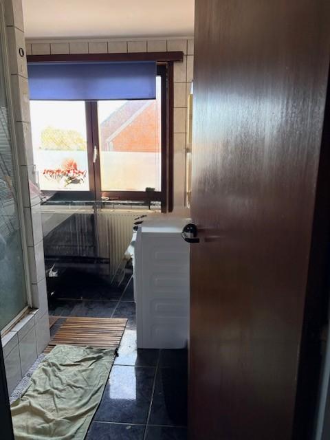 Badkamer met douche, bergplaats en één slaapkamer met vaste trap naar de zolder.