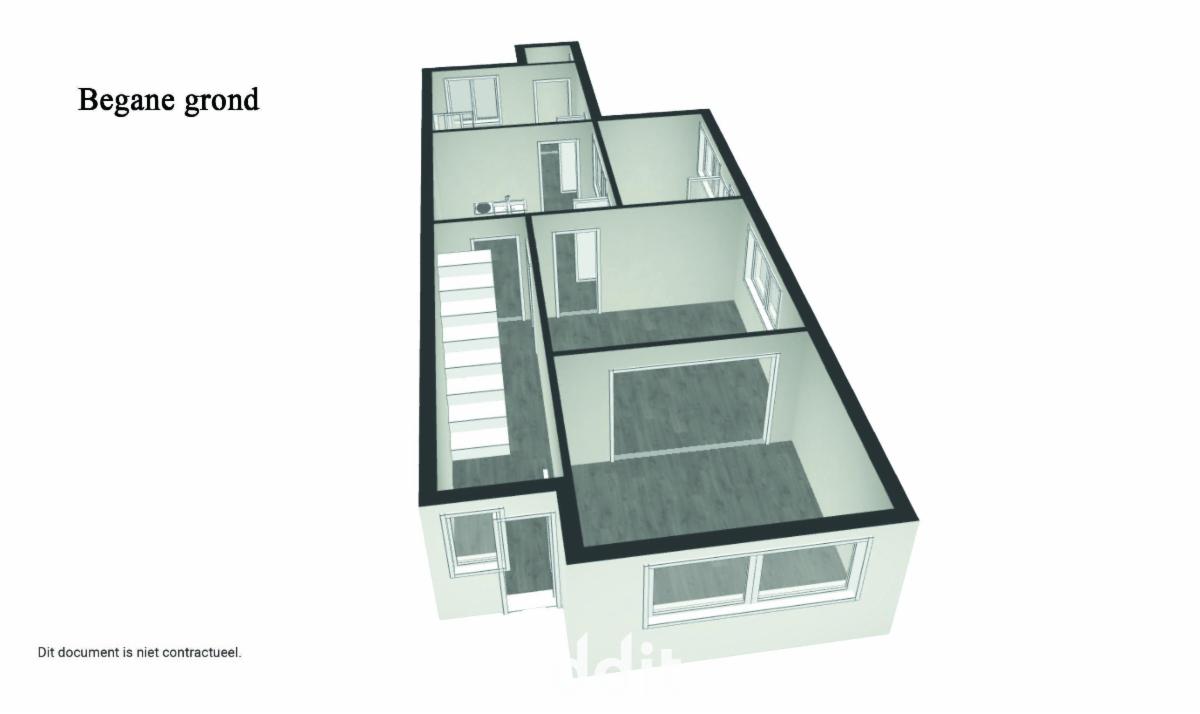 gelijkvloers: inkomhal, woonkamer, eetkamer, keuken, badkamer met apart toilet, veranda, kelder;